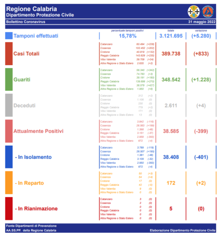 – Reggio Calabria: CASI ATTIVI 3151 (42 in reparto, 0 in terapia intensiva, 3109 in isolamento domiciliare); CASI CHIUSI 140478 (139699 guariti, 779 deceduti).