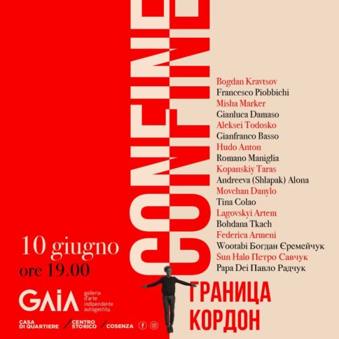 In questa direzione, il collettivo GAIA, dopo aver riflettuto sui concetti di spazio, identità, corpo e animalità, ha avvertito la pressante necessità, anche alla luce dell’attuale temperie culturale e delle tese relazioni geopolitiche tra molti Paesi del mondo, di dedicare il suo nuovo allestimento proprio al concetto di confine che, già nella grafica di presentazione, si annuncia come una sorta di specchio linguistico infranto, riproducendosi, per gemmazione, dall’italiano all’ucraino e, così, al russo, dando inizio a una catena metaforicamente infinita. Più di 15 artisti, provenienti da Russia, Ucraina e Italia, condivideranno con noi le loro opere pittoriche, fotografie, disegni, video-installazioni, illustrazioni.