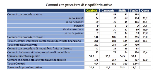 Dalla relazione per la Commissione sul federalismo «si evince la consistenza del fenomeno (65 casi) e la sua concentrazione territoriale in alcune regioni», appunto Sicilia (19), Campania (13) e Calabria (10, di cui 8 dissesti). Secondo le tabelle allegate alla relazione, in Calabria i Comuni con procedure attive sono 82 (di questi 54 con dissesti, 28 con riequilibri, più 19 in istruttoria), una percentuale pari al 20,3% del totale regionale (in Campania sono il 14,9%, in Sicilia il 23,3%) mentre i Comuni con procedure chiuse sono 116. In Calabria – prosegue la Corte dei Conti – sono in totale 200 (sui 404 complessivi) i Comuni «interessati da procedure di criticità finanziaria», con 292 procedure attivate: 42 i Comuni con procedure di riequilibrio finite in dissesto, 77 i Comuni che hanno attivato procedure di riequilibrio e 178 i Comuni che hanno attivato procedure di dissesto. «Sotto il profilo qualitativo – sostiene la Corte dei Conti – il fenomeno è ancora più rilevante in quanto coinvolge molti centri urbani importanti, tra cui numerosi capoluoghi di provincia – Avellino, Benevento, Caserta e Napoli in Campania, Catania, Messina, Palermo in Sicilia, Cosenza, Reggio Calabria e Vibo Valentia in Calabria». La magistratura contabile peraltro rileva anche «la scarsa efficacia della procedura di riequilibrio introdotta nel 2012. Nei 234 Comuni delle tre Regioni in cui è stata attivata si registra una percentuale di fallimenti (con conseguente dichiarazione di dissesto) di circa il 40 per cento – 39,7, con una punta del 54,5% in Calabria – corrispondente a 93 casi». C’è poi un altro vulnus, secondo la Corte dei Conti: «Il lungo tempo dell’istruttoria costituisce un forte elemento di criticità. Tra gli 80 casi registrati, per quanto riguarda la Calabria (su 17 casi dei 19 indicati) solo Terranova da Sibari, che ha appena approvato il Piano e Cetraro presentano un tempo di attesa inferiore ai 100 giorni. Negli altri casi il tempo trascorso è particolarmente elevato: a ridosso dei 1.000 giorni in 4 casi, tra 1.000 e 1.500 giorni in altri 4 e addirittura superiore a 2.000 (oltre 6 anni) in 5 casi. I Comuni di Simbario e Guardavalle chiudono la graduatoria con oltre 3.000 giorni di attesa… È evidente che il meccanismo vigente presenta, sotto questo profilo, una grave incongruenza, in quanto la tempestività dell’intervento costituisce un elemento essenziale per evitare il peggioramento della crisi finanziaria».