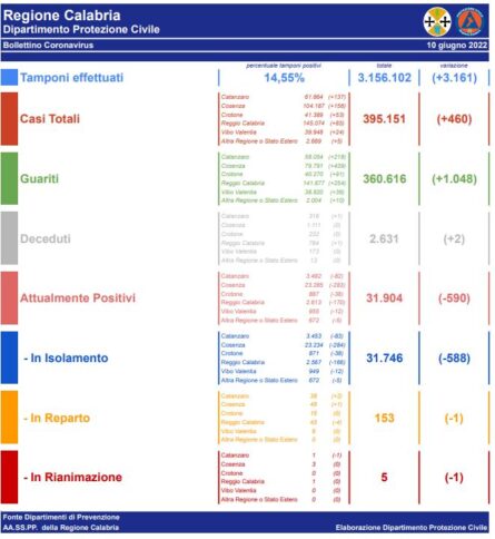– Reggio Calabria: CASI ATTIVI 2613 (45 in reparto, 1 in terapia intensiva, 2567 in isolamento domiciliare); CASI CHIUSI 142461 (141677 guariti, 784 deceduti).