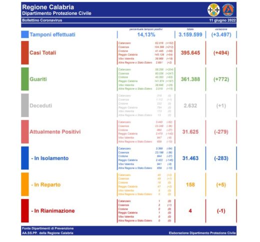 – Reggio Calabria: CASI ATTIVI 2470 (47 in reparto, 1 in terapia intensiva, 2422 in isolamento domiciliare); CASI CHIUSI 142658 (141874 guariti, 784 deceduti).