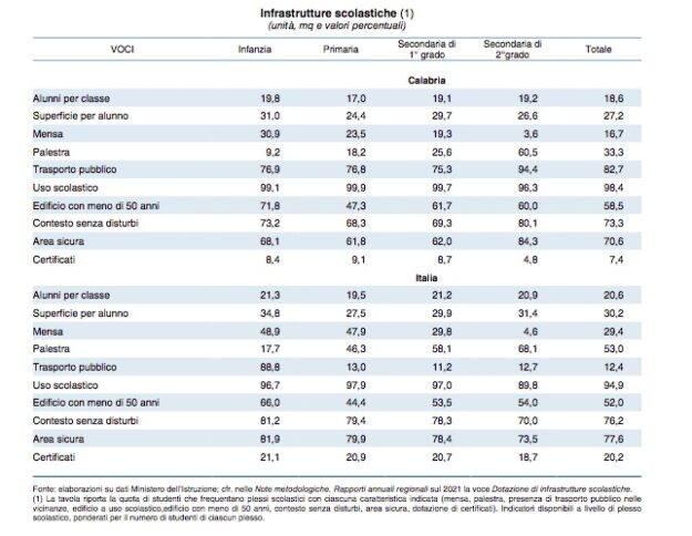 Capitolo sicurezza: secondo il rapporto della Banca d’Italia «le scuole calabresi presentano un notevole divario (circa 13 punti percentuali in meno, il 7,4 per cento rispetto al 20,2 per cento) rispetto al dato nazionale per l’indicatore relativo al possesso dei certificati (agibilità, omologazione della centrale termica, valutazione rischi e piano di evacuazione). Gli altri profili riguardanti la sicurezza mostrano invece minori carenze. Sebbene il 59 per cento degli studenti frequenti edifici costruiti meno di 50 anni fa, l’incidenza di quelli costruiti appositamente a uso scolastico è superiore alla media nazionale (rispettivamente 98 e 95 per cento), raggiungendo la quasi totalità per gli edifici adibiti a scuola primaria e secondaria di primo grado. La percentuale di studenti che frequenta una scuola inserita in un contesto ambientale privo di elementi di disturbo (ad es. per la vicinanza ad una discarica o ad altre fonti di inquinamento) o in un’area considerata sicura (ad es. perché lontana da zone di grande traffico o degradate) risulta solo leggermente inferiore al resto del Paese (rispettivamente 73 e 71 per cento; sono 76 e 78 le quote per l’Italia)». Bankitalia comunque dispensa anche “consigli” per il futuro: «Come documentato da alcuni studi lo stato delle infrastrutture è un fattore rilevante che può favorire i processi di apprendimento e influenzare l’accumulazione di capitale umano, contribuendo a spiegare le differenze in termini di competenze e risultati conseguiti e il tasso di dispersione implicita. Prioritario è pertanto assicurarne la disponibilità e lo sviluppo qualitativo sul territorio, obiettivo condiviso anche nell’ambito del Pnrr. Quest’ultimo dedica alle infrastrutture scolastiche 6,6 miliardi, di cui 3,4 relativi a progetti già in essere e 3,2 miliardi per nuovi progetti. Le risorse sono principalmente destinate alla costruzione di nuove scuole e la messa in sicurezza di quelle esistenti (circa il 90 per cento), mentre la quota residua è destinata alla realizzazione e riqualificazione di locali da adibire a mense e impianti sportivi. Il riparto dei fondi è stato realizzato tenendo anche conto dei divari infrastrutturali: alla Calabria è destinato il 5,4 per cento delle risorse complessive». (redazione@corrierecal.it)