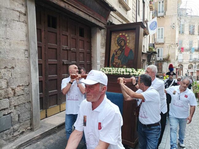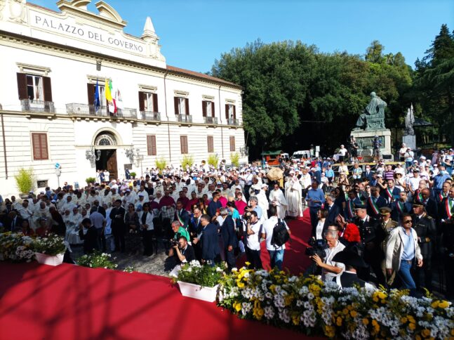 COSENZA Oggi l’arrivo del cardinale Segretario di Stato, Pietro Parolin, a Cosenza, in rappresentanza del Papa, alla cerimonia per l’800esimo anniversario della dedicazione della Cattedrale. L’icona della Madonna del Pilerio, attualmente custodita e venerata nella Cattedrale di Cosenza, nella cappella a lei dedicata, è stata portata in corteo dal Duomo al palco allestito in piazza XVI marzo dove il cardinale Parolin celebrerà la Santa Messa. Presente in corteo la banda città di Mendicino. L’ultima uscita al di fuori della cattedrale della sacra icona si era registrata nel periodo di pandemia. Di tutt’altro tenore e partecipazione la processione di quest’oggi invece.