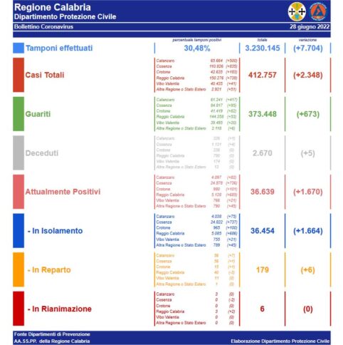 L’Asp di Cosenza comunica: «Oggi si registrano 4 decessi: 1 in Reparto e 3 in struttura socio assistenziale per anziani, di questi ultimi 1 è avvenuto in data 03/05/2022 e se ne è avuta notizia tramite scheda Istat e 2 sono avvenuti rispettivamente in data 12/09/2021 e 06/10/2021 e se ne avuta notizia tramite consultazione della piattaforma nazionale Covid-19 dell’Iss, aggiornata in data 27/06/2022».