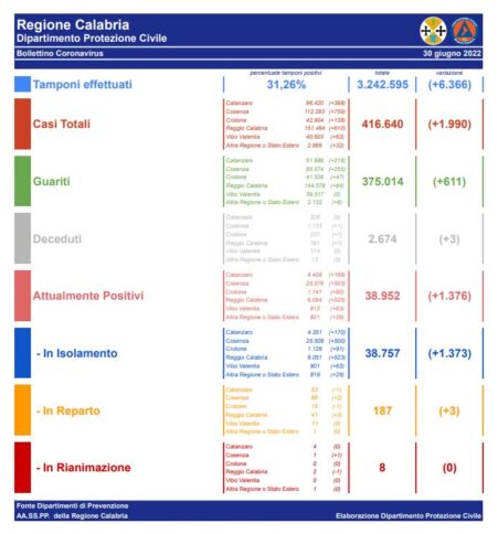 CATANZARO In Calabria, ad oggi, il totale dei tamponi eseguiti sono stati 3242595 (+6.366). Le persone risultate positive al Coronavirus sono 416640 (+1.990) rispetto a ieri. Questi sono i dati giornalieri relativi all’epidemia da Covid-19 comunicati dai Dipartimenti di Prevenzione delle Asp della Regione Calabria.