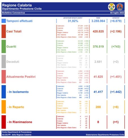 – Reggio Calabria: CASI ATTIVI 6782 (44 in reparto, 2 in terapia intensiva, 6736 in isolamento domiciliare); CASI CHIUSI 145937 (145145 guariti, 792 deceduti).