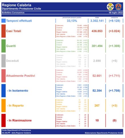 CATANZARO In Calabria, ad oggi, il totale dei tamponi eseguiti sono stati 3.302.141 (+9.128). Le persone risultate positive al Coronavirus sono 436.853 (+3.024) rispetto a ieri. Questi sono i dati giornalieri relativi all’epidemia da Covid-19 comunicati dai Dipartimenti di Prevenzione delle Azienda sanitarie provinciali della Regione Calabria.