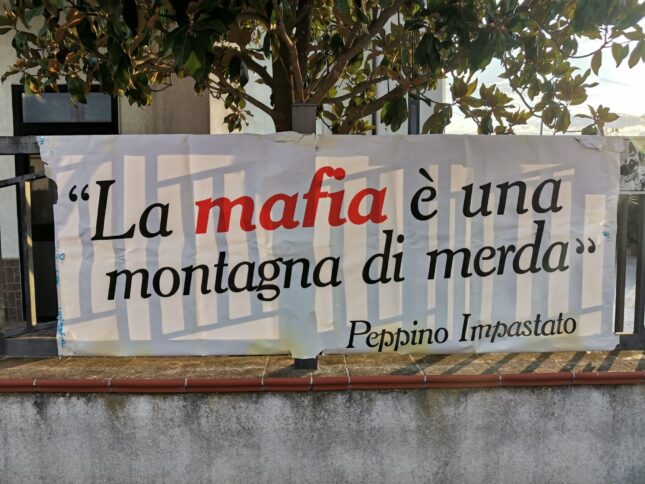 Il sindaco Luigi Foresta, insieme ad alcuni membri dell’Amministrazione, hanno affisso due striscioni davanti casa dell’ex consigliere comunale e provinciale con due frasi di Peppino Impastato: «La mafia uccide, il vostro silenzio pure» e «La mafia è una montagna di m…a».