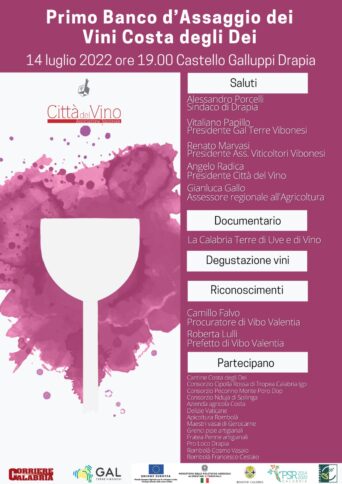 Alla presenza del sindaco di Drapia Alessandro Porcelli, del Presidente del Gal Serre vibonesi Vitaliano Papillo, del Presidente dell’associazione viticoltori vibonesi Renato Marvasi, di Città del vino Angelo Radica e dell’assessore regionale all’agricoltura Gianluca Gallo, verrà presentato il documentario “Calabria terra di uve e di vino“.