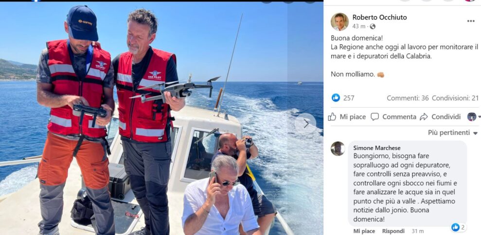 CATANZARO «Buona domenica! La Regione anche oggi al lavoro per monitorare il mare e i depuratori della Calabria». È con un nuovo post sul proprio profilo Facebook che il governatore della Calabria annuncia il prosieguo dell’attività di contrasto al mare sporco lungo le coste calabresi. Un’attività condotta con il supporto di droni e di team specifico messo in piedi dalla Regione. E almeno a giudicare dai commenti che si registrano sui social qualche risultato incoraggiante inizia a registrarsi.