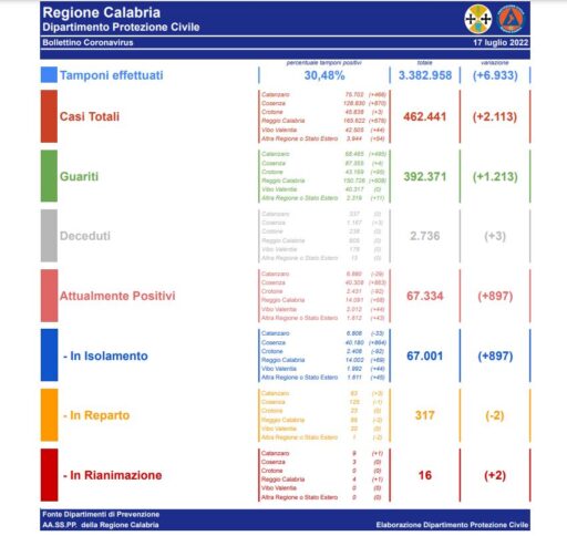 CATANZARO In Calabria, ad oggi, il totale dei tamponi eseguiti sono stati 3.382.958 (+6.933). Le persone risultate positive al Coronavirus sono 462.441 (+2.113) rispetto a ieri. Questi sono i dati giornalieri relativi all’epidemia da Covid-19 comunicati dai Dipartimenti di Prevenzione delle Asp della Regione Calabria.