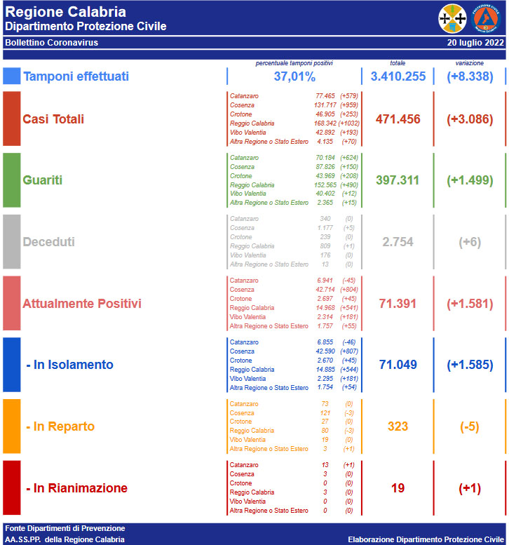 CATANZARO Scende rispetto a ieri, ma resta sempre alto il numero dei contagi Covid in Calabria (+3.086) dove si registrano 6 nuovi decessi. Il tasso di positività è del 37,01%, salgono a 19 i ricoverati in terapia intensiva, mentre calano di 5 unità quelli d’area medica. Sono 71.391 i casi attivi in regione.