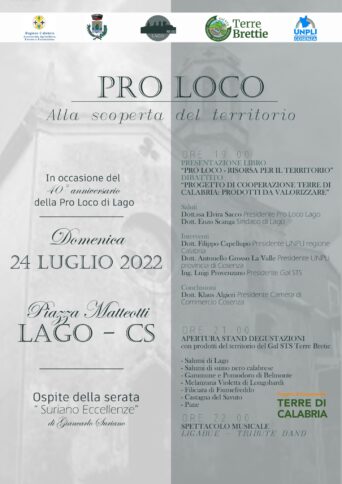 COSENZA La “Pro loco Lago” festeggia i suoi primi 40 anni, un traguardo importante che intende condividere con tutta la cittadinanza. Presente sul territorio sin dal 1982, l’associazione si è distinta finora per le sue azioni di promozione e valorizzazione della cultura e delle tradizioni, sempre all’insegna del volontariato. Per tale motivo, i festeggiamenti che si terranno Domenica 24 luglio , saranno improntati non solo sulla celebrazione del quarantennale, ripercorrendo le tappe più salienti del suo operato, attraverso ricordi e racconti, ma daranno spazio al dibattito pubblico “Alla scoperta del territorio”. Si tratta di un incontro dedicato alla presentazione del libro ” Pro loco – Risorsa per il territorio”, dell’ Unpli Nazionale, con a seguito il progetto di Cooperazione “Terre di Calabria: prodotti da valorizzare” promosso dal Gal STS. A fare gli onori di casa sarà il Presidente della Pro Loco Elvira Sacco , che insieme al Sindaco di Lago, Enzo Scanga, daranno il benvenuto ai Dirigenti dell”Unpli Regionale e Provinciale, Filippo Capellupo e Antonello Grosso La Valle, oltre che al presidente del Gal STS, Luigi Provenzano e al Presidente della Camera di Commercio Klaus Algieri. Un momento importante e condiviso che vuole sfociare in una serata gioviale e partecipata, attraverso l’allestimento di stand enogastronomici con tanti prodotti agroalimentari locali. La serata allietata dalla “cover band di Ligabue” ,si concluderà con il taglio della torta in piazza. «La manifestazione sarà un modo per dimostrare quanto la Pro loco Lago nel corso di questi anni ha fatto, mantenendo saldo il senso di appartenenza e identità, attraverso azioni culturali e sociali , e continuerà a farlo per il bene di tutta la comunità», commenta il presidente Sacco.