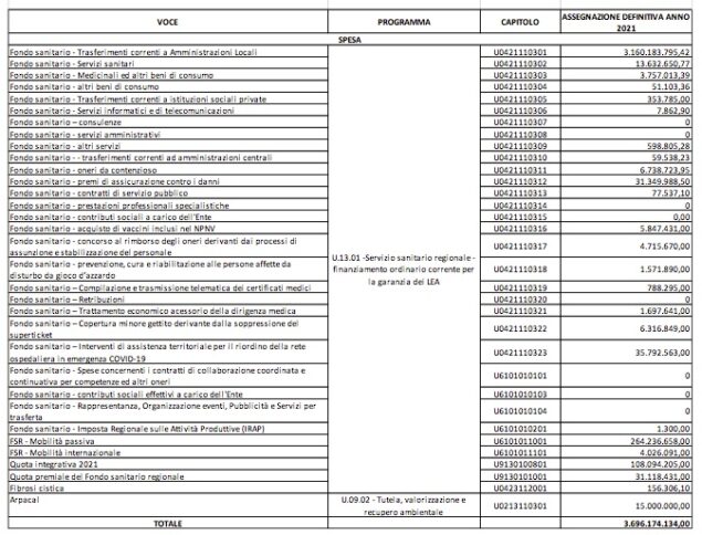 Nella relazione al Rendiconto della Regione si evidenzia in primo luogo che «il bilancio di previsione assestato dell’esercizio 2021 pareggia in euro 10.093.696.462,53. Le entrate che hanno formato oggetto della gestione di competenza dell’esercizio 2021, al netto delle contabilità speciali, ammontano ad euro 7.384.903.732,67. Di esse sono stati regolarmente accertati euro 6.117.421.260,46 e riscossi in conto competenza euro 4.987.108.724,36. Emerge chiaramente che le entrate del titolo I accertate nell’anno 2021, che ammontano ad euro 4.509.391.682,89 rappresentano circa il 74% del totale delle risorse disponibili (entrate totali al netto delle contabilità speciali). Deve precisarsi, tuttavia, che gran parte di dette entrate – spiega la Giunta – è destinata alla sanità, ove si consideri che al servizio sanitario nazionale è devoluta la compartecipazione all’Iva pari ad oltre 3.339,02 Meuro, una quota dell’Irap pari ad euro 108,09 Meuro e una quota dell’Irpef pari a oltre 191,6 Meuro e un’altra parte dell’addizionale Irpef, pari a 123,78 Meuro, derivante dai provvedimenti fiscali in materia di addizionale Irper assunti con la legge regionale 7 agosto 2002, numero 30 e successive modifiche ed integrazioni, nonché i 27,26 Meuro derivanti dall’applicazione dell’extra aliquota Irap introdotta al fine di ripianare i disavanzi di gestione in materia di spesa sanitaria, ai sensi dell’art 1, comma 173 della legge 311/2004».