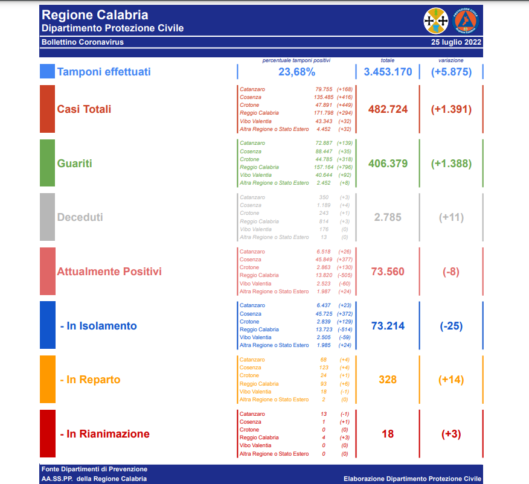 CATANZARO In Calabria, ad oggi, il totale dei tamponi eseguiti sono stati 3.453.170 (+5.875). Le persone risultate positive al Coronavirus sono 482.724 (+1.391) rispetto a ieri. Questi sono i dati giornalieri relativi all’epidemia da Covid-19 comunicati dai Dipartimenti di Prevenzione delle Aziende sanitarie provinciali della Regione Calabria.