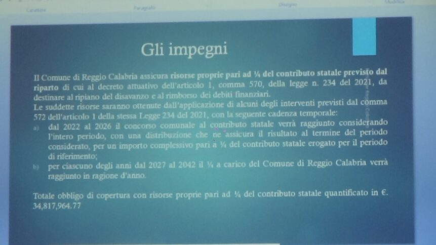 «Il requisito per avere questo contributo ventennale – ha spiegato Calabrò – è quello di essere un comune di Città metropolitana con un disavanzo pro capite superiore ai 700 euro, attualmente i cittadini del comune di Reggio Calabria hanno un disavanzo di circa 1.300 euro. Nel momento in cui si raggiungerà la soglia inferiore ai 700 euro saremo contenti di non riceve più questo contributo perché vorrà dire che avremo raggiunto l’obiettivo», ha affermato l’assessore alle Finanze.