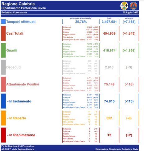 CATANZARO In Calabria, ad oggi, il totale dei tamponi eseguiti sono stati 3497681 (+7.155). Le persone risultate positive al Coronavirus sono 494939 (+1.843) rispetto a ieri. Questi sono i dati giornalieri relativi all’epidemia da Covid-19 comunicati dai Dipartimenti di Prevenzione delle Asp della Regione Calabria.