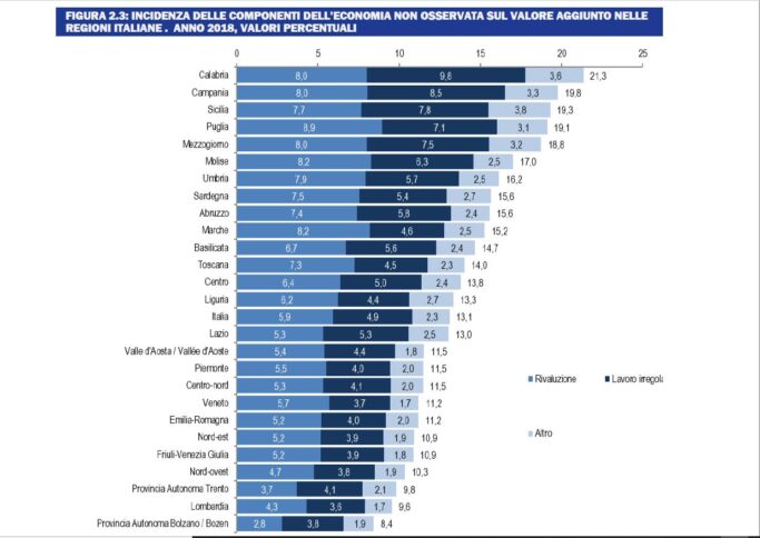 «L’alta incidenza dell’economia non osservata è una connotazione strutturale della Calabria. Le spiegazioni sono diverse. La prima, e più importante, è legata alla fragilità endemica della struttura produttiva regionale e all’informalità di svariate attività economico-imprenditoriali nel campo dei servizi e della produzione. Assetti dominati da imprese polverizzate e dall’assenza di aziende di medie e grandi dimensioni sono di per sé altamente permeabili al sommerso. Conta molto anche la composizione settoriale: in Calabria sono comparativamente più importanti, comparti fisiologicamente più esposti all’affondamento di redditi e dell’ occupazione, come l’edilizia, il turismo, l’agricoltura, la distribuzione commerciale, le attività professionali autonome, i servizi alle persone e alle famiglie, le attività labour intensive. Comparti accomunati da una spinta destrutturazione organizzativa, da stagionalità e aleatorietà. Inoltre, incide il peso più denso nella nostra regione dell’economia criminale e mafiosa, delle attività illegali nel sommerso profondo. Più contenuto è invece il sommerso nell’industria manifatturiera, dove non solo è più difficile occultare dichiarazioni e costi a ragione della fitta interconnessione funzionale tra le imprese, ma anche perché ben più diffusa, per ragioni storiche, è la cultura della legalità».