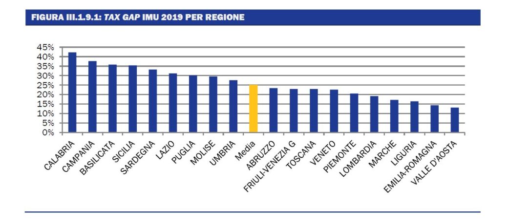 Osservando poi in dettaglio la “Relazione sull’economia non osservata e sull’evasione fiscale e contributiva anno 2021” del ministero delle Finanze, fotografa altri record poco edificanti che riguardano la Calabria. Infatti ha l’indicatore più alto del Paese del tax gap dell’Imu: 42,3% del gettito teorico. Così come del tax gap della Tasi: 40,9% del gettito teorico.