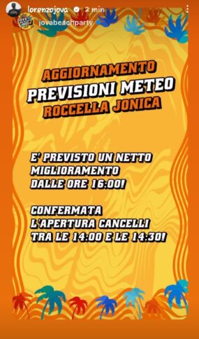 ROCCELLA JONICA «Adesso sta piovendo, ma le previsioni dicono che per la tarda mattinata ci sarà miglioramento e sole dal pomeriggio. Vi teniamo informati. Io sono sul posto e vi comunicheremo gli sviluppi». Jovanotti sul suo profilo Instagram rassicura così le migliaia di persone che da mesi stanno aspettando di assistere allo spettacolo del Jova Beach Party a Roccella Jonica. Due tappe, quella di oggi e quella di domani, che rischiano di essere rovinate dal maltempo che si sta abbattendo sulla Calabria. «Sono felicissimo di essere tornato qui in Calabria», afferma il cantautore, che nella diretta Instagram parla anche dei Bonzi di Riace: «In questi giorni ricorre il cinquantesimo anniversario dal ritrovamento dei Bronzi di Riace, quando ho letto questa notizia mi sono emozionato», racconta Jovanotti che definisce le statue «due meraviglie»: «Ammirarli è un’esperienza potente», afferma invitando i suoi follower ad andare a vederli a Reggio Calabria. E infine, un ultimo invito ai suoi fan: «Venite al Jova Beach Party, venite a divertirvi».