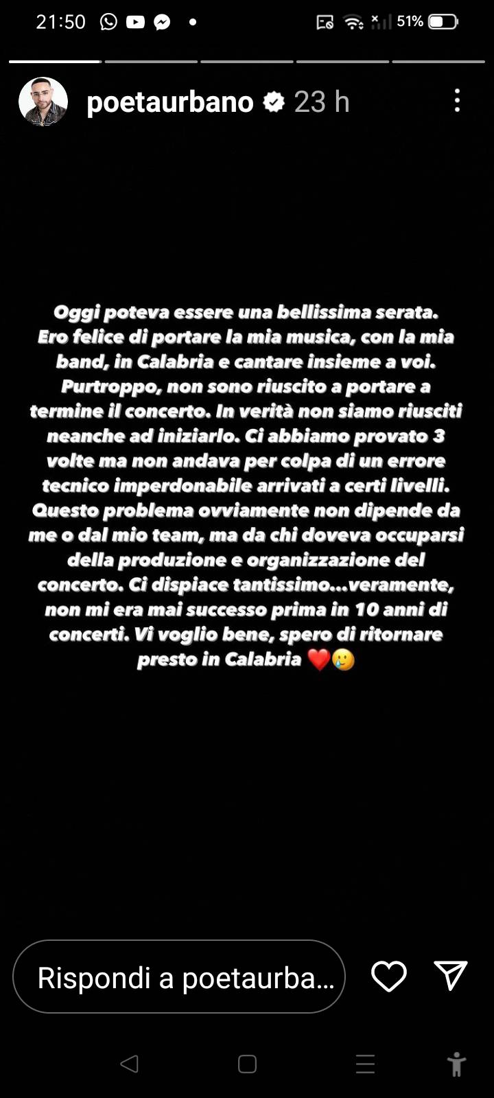 Il rapper, a fine sventura, si è rivolto sconsolato ai fan: «Ero lì dietro a cercare di trovare una soluzione a questo problema, che purtroppo non dipende né da me né dal mio staff. Siamo venuti qua, ci siamo fatti cinque ore di macchina per venire a suonare a Savelli, ed eravamo orgogliosi di suonare in Calabria, di offrire una data del mio tour a tutti voi che siete miei fan, che avete pagato per venire ad ascoltare questo concerto».