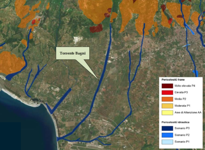 Nel progetto definitivo sono previsti, inoltre, gli interventi di manutenzione nell’alveo del Torrente Bagni lungo quasi 2 km (1.800 metri), per ripristinare l’officiosità idraulica del torrente, dal decespugliamento alla risagomatura delle sezioni, riportando le stesse nello status quo ante. Dalla modellazione idraulica condotta in fase di progettazione esecutiva è risultato che il ripristino della “continuità plano-altimetrica degli argini esistenti”, come richiesto nel citato parere dell’Autorità, non è sufficiente da solo a garantire l’assenza di esondazione, in quanto, dal rilievo esecutivo effettuato è risultato che l’alveo del torrente non presenta sezioni regolari, con una valutazione di pericolosità “alta” (P3).