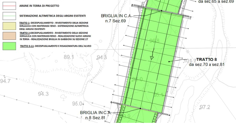 Per queste ragioni, il criterio principale adottato per la sistemazione è stato quello di risagomare le sezioni dell’alveo considerando una suddivisione del torrente in diversi tratti. Nel primo tratto, comprendente il ponte della strada provinciale e che si estende dalla vasca di calma sino ai due muri posti a contenimento degli argini in terra, sarà eseguita una semplice pulizia dell’alveo con rimozione della vegetazione presente. Nel secondo tratto, invece, è previsto il decespugliamento e la pulizia delle sezioni di magra; la risagomatura dell’alveo; la demolizione della briglia e la realizzazione di una nuova in gabbioni; la realizzazione di due argini in terra lungo la sponda sinistra e destra. Nel tratto tre, quattro, cinque, sei e sette è previsto il decespugliamento e la pulizia delle sezioni di magra, oltre alla risagomatura dell’alveo. Nel tratto otto, invece, è prevista anche la chiusura dei fori di drenaggio del muro di sfioro laterale in cemento armato, i quali nello stato di fatto causano allagamenti all’esterno dell’alveo del torrente Bagni mentre nel tratto 9 è prevista anche la realizzazione, in sinistra idraulica, di un argine in terra con un’altezza massima pari a tre metri. Infine, nei tratti 10 e 11, è prevista la risagomatura dell’alveo, il decespugliamento e pulizia delle sezioni di magra e delle fasce golenali.