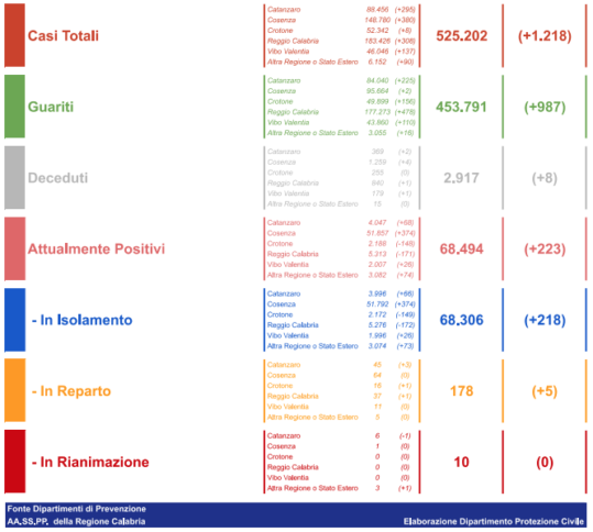 CATANZARO Le persone risultate positive al Coronavirus, in Calabria, nelle ultime 24 ore, sono 1.218: numero che porta il totale dei casi positivi a 525.202.
