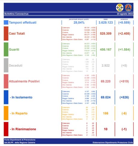 – Reggio Calabria: CASI ATTIVI 5110 (41 in reparto, 0 in terapia intensiva, 5069 in isolamento domiciliare); CASI CHIUSI 179161 (178321 guariti, 840 deceduti).