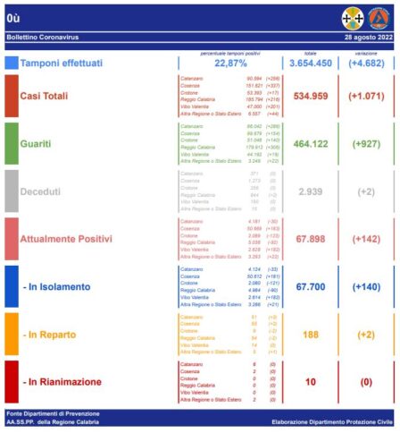 Questi sono i dati giornalieri relativi all’epidemia da Covid-19 comunicati dai Dipartimenti di Prevenzione delle Aziende sanitarie provinciali della Regione Calabria.