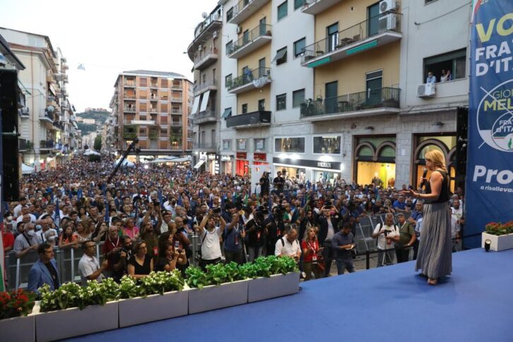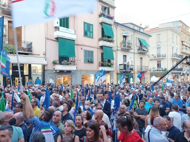 COSENZA Fratelli d’Italia, chiamato alla sfida decisiva, vuole farsi trovare pronto. L’obiettivo è governare il Paese, ma anche recuperare terreno nei confronti delle altre forze politiche in Calabria e questo Giorgia Meloni lo sa bene. Ecco perché la presidente di FdI ha scelto la centralissima piazza Kennedy a Cosenza, per il primo e unico comizio pubblico calabrese. Circa 4mila i sostenitori che hanno accolto Meloni. Nel retropalco presenti i big di Fdi, la parlamentare uscente Wanda Ferro, gli assessori regionali Fausto Orsomarso e Filippo Pietropaolo, il sindaco di Locri Giovanni Calabrese, ed ancora Giuseppe Neri ed Ernesto Rapani.
