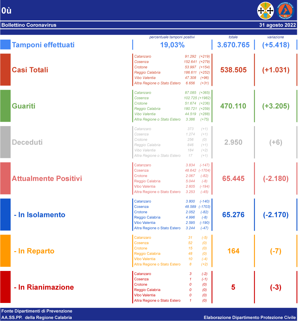 – Reggio Calabria: CASI ATTIVI 5044 (48 in reparto, 0 in terapia intensiva, 4996 in isolamento domiciliare); CASI CHIUSI 181567 (180721 guariti, 846 deceduti).