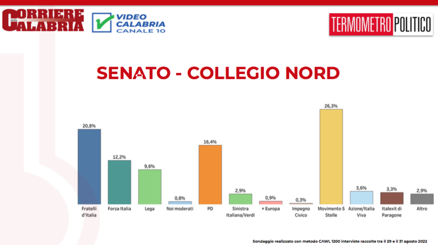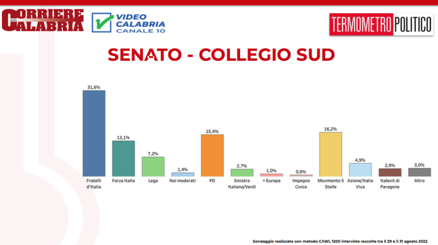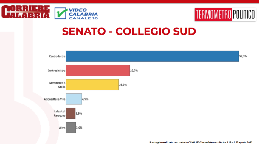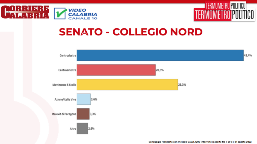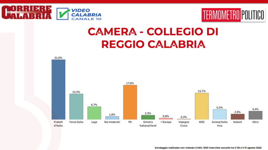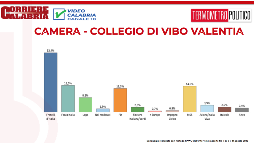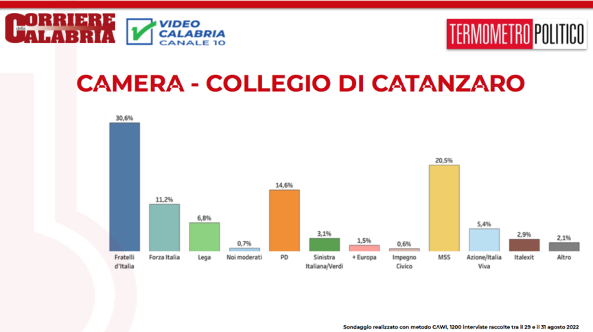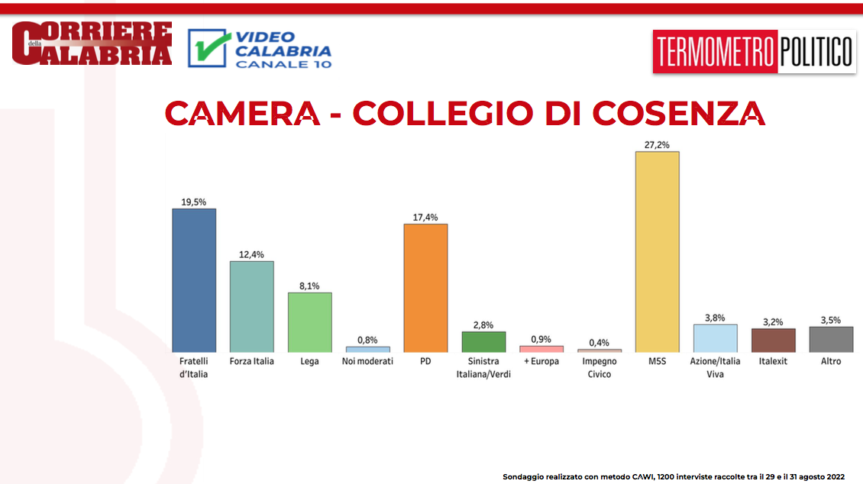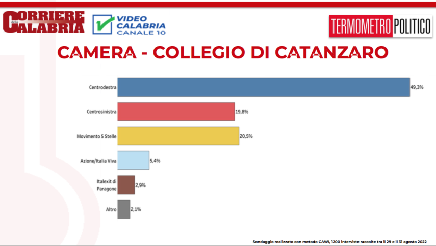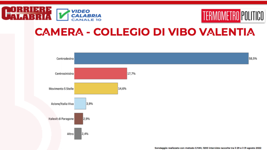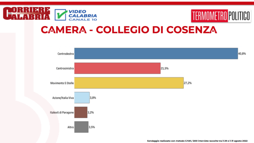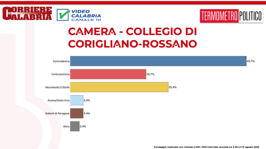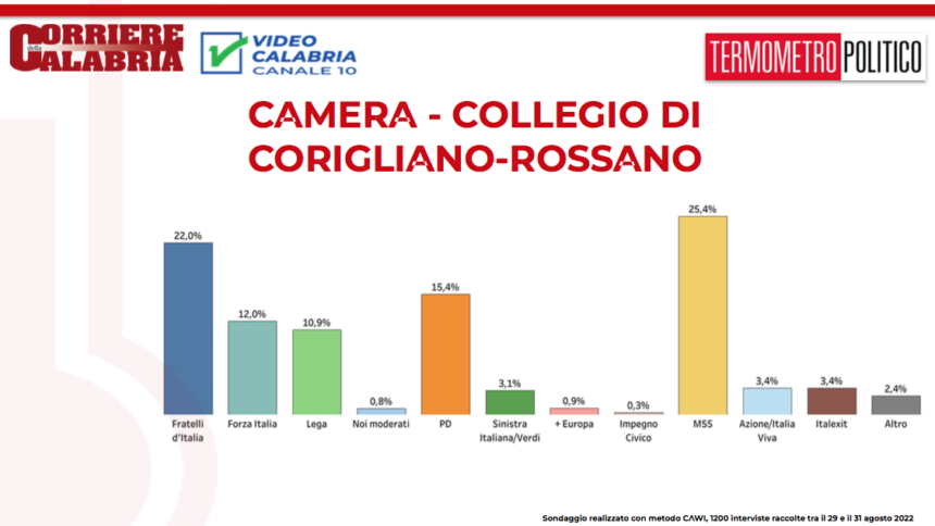 LAMEZIA TERME A coalizioni schierate e rilevazione “mista” (somministrazione classica e online) ultimata si ragiona su un possibile sette a zero per il centrodestra nei collegi uninominali in Calabria. L’esito del sondaggio lanciato da Corriere della Calabria, Video Calabria, L’altro Corriere Tv e Termometro politico assegna un primato netto al centrodestra, trainato dal boom di Fratelli d’Italia. Unica, per quanto teorica, possibilità di evitare il “cappotto” sarebbe stato il ricorso al campo largo. Per quanto non sempre – anzi, raramente – in politica sia possibile sommare i voti delle singole forze, emerge un dato: i collegi della Camera Cosenza-Tirreno e Corigliano Rossano-Crotone così come il collegio senatoriale Cosenza-Crotone sarebbero stati “contendibili” da una coalizione di centrosinistra allargata. Questo, lo dicono i numeri, grazie alla sostanziale tenuta del M5S nella Calabria settentrionale, dove supera largamente il 20% (pur tenendo presente che nelle Politiche del 2018 aveva varcato la soglia del 50%). Tanto per essere ancora più chiari: nei tre collegi (due Camera, uno Senato) del Nord, il Movimento Cinquestelle resta il primo partito, superando anche Fratelli d’Italia. Il calo è più avvertito nelle province di Catanzaro, Vibo Valentia e Reggio Calabria, dove il centrodestra si posiziona su numeri inavvicinabili. E Fratelli d’Italia va oltre il 30%. Ma analizziamo il voto collegio per collegio come appare nella nostra valutazione.