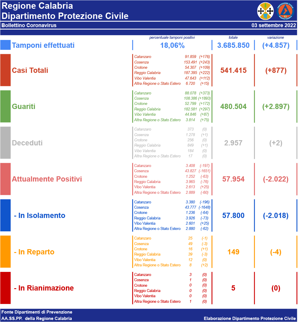 – Reggio Calabria: CASI ATTIVI 3965 (39 in reparto, 0 in terapia intensiva, 3926 in isolamento domiciliare); CASI CHIUSI 183430 (182581 guariti, 849 deceduti).