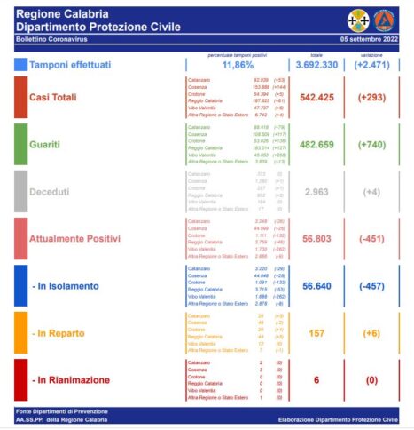 – Reggio Calabria: CASI ATTIVI 3759 (44 in reparto, 0 in terapia intensiva, 3715 in isolamento domiciliare); CASI CHIUSI 183866 (183014 guariti, 852 deceduti).