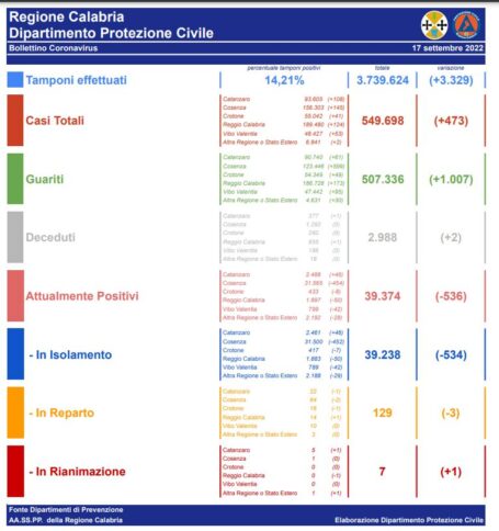 CATANZARO In Calabria, ad oggi, il totale dei tamponi eseguiti sono stati 3739624 (+3.329).Le persone risultate positive al Coronavirus sono 549698 (+473) rispetto a ieri. Questi sono i dati giornalieri relativi all’epidemia da Covid-19 comunicati dai Dipartimenti di Prevenzione delle Aziende sanitarie provinciali della Regione Calabria.