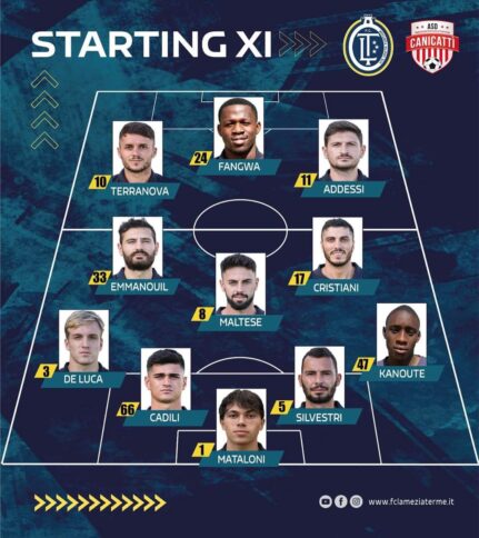 FC LAMEZIA T. (4-3-3): Mataloni; Kanoute Silvestri Cadili De Luca; Cristiani Maltese Emmanouil; Terranova (33’ st Cunzi) Fangwa Addessi (16’ st Alma). A disp.: Martino, Abatneh, Zulj, Tipaldi, Borgia, Maimone, Ferreira. All. Novelli