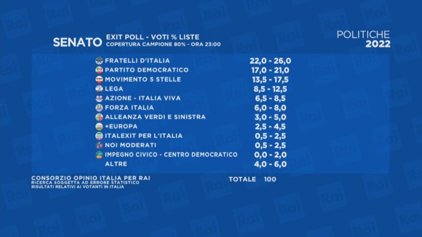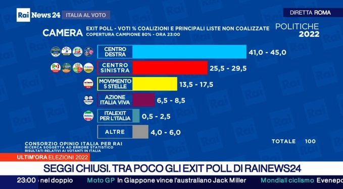 ROMA Secondo il primo Exit poll del Consorzio Opinio Italia per la Rai, alla Camera la coalizione di centrodestra è avanti al 41-45%mentre la coalizione di centrosinistra è al 25,5-29,5% e M5s è al 13,5%-17,5%. Azione-Italia Viva è al 6,5-8,5%. Italexit per l’Italia 0,5-2,5. Altri 4-6.