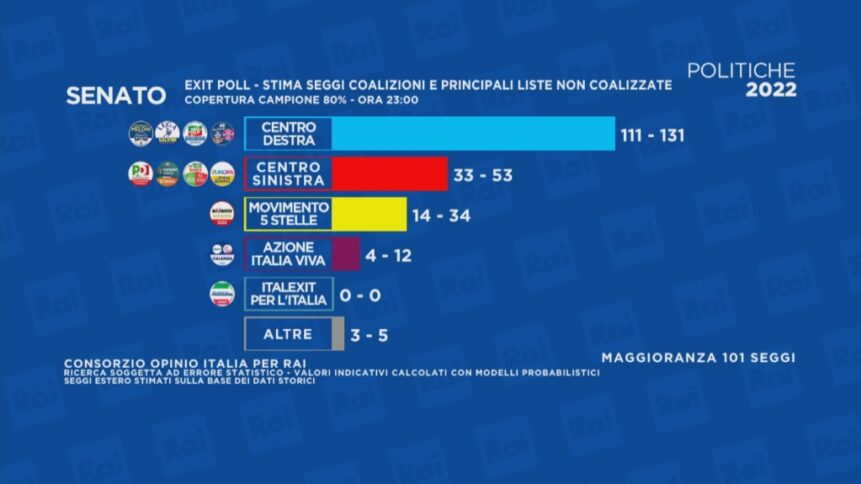 Per il primo instant poll Quorum/Youtrend per SkyTg24 alla Camera il Centrodestra avrebbe 228 seggi, il Centrosinistra 95, il Movimento 5 Stelle 47, Azione e Italia viva 19, altri 3, estero 8. Al Senato, invece, il Centrodestra è in vantaggio con 115 seggi, Centrosinistra 44, Movimento 5 Stelle 24, Azione/Iv 10, altri 3, estero 4.