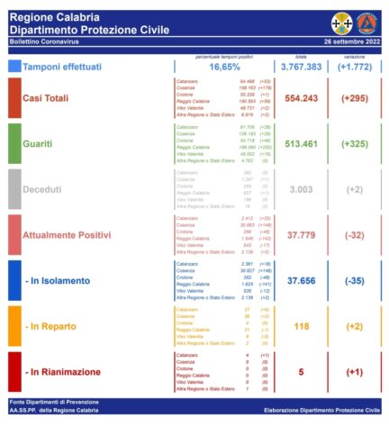 – Reggio Calabria: CASI ATTIVI 1646 (21 in reparto, 0 in terapia intensiva, 1625 in isolamento domiciliare); CASI CHIUSI 188947 (188090 guariti, 857 deceduti).
