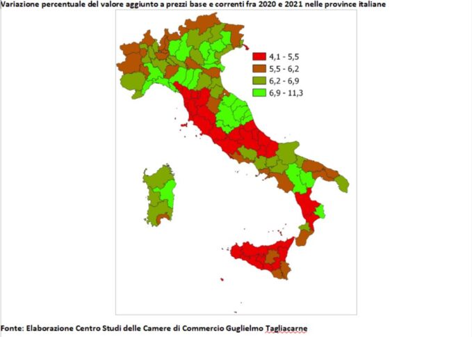 In assoluto però è il Crotonese ad aggiudicarsi la performance più elevata di incremento di ricchezza prodotta: tra 6,9% e l’11,3%. Percentuali di crescita che però non sono serviti a colmare il divario nel confronto con la fase pre pandemica.
