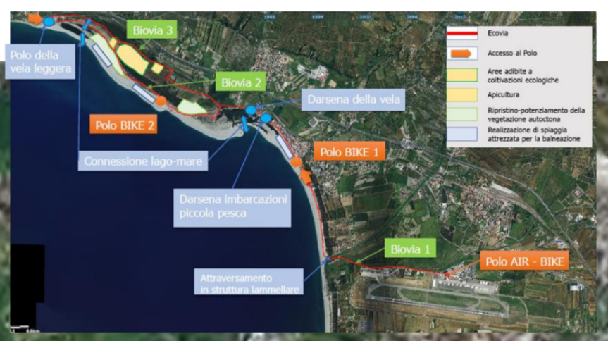 Strategica poi la riqualifica ambientale della fascia nord dell’aeroporto. Qui l’investimento previsto è pari a 7 milioni di euro. Fondi che serviranno a realizzare una pista ciclabile per la valorizzazione ecosostenibile della fascia costiera, con due “polo bike”, realizzazione di spiagge attrezzate, “Polo della vela” dei laghi “La La Vota”. Un progetto quasi avveniristico, ma che permetterebbe una vera rinascita della fascia costiera tirrenica che tocca i Comuni di Lamezia Terme e Gizzeria.