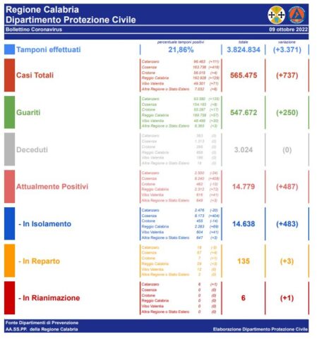 CATANZARO Le persone risultate positive al Coronavirus sono 565475 (+737) rispetto a ieri. Questi sono i dati giornalieri relativi all’epidemia da Covid-19 comunicati dai Dipartimenti di Prevenzione delle Aziende sanitarie provinciali della Regione Calabria.