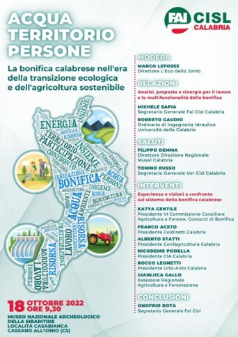CASSANO ALLO IONIO “Acqua, Territorio, Persone. La bonifica calabrese nell’era della transizione ecologica e dell’agricoltura sostenibile” è il tema promosso dal convegno organizzato dalla Fai Cisl Calabria in programma il prossimo 18 ottobre presso il Museo Nazionale Archeologico della Sibaritide a Cassano all’Ionio. L’evento fa parte di una serie di iniziative regionali, all’interno di un programma della Fai Cisl, in occasione dei cento anni dalla nascita della bonifica moderna, che si concluderanno con una giornata nazionale.