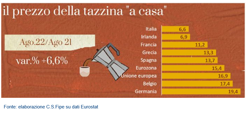 Insomma la tazzina di caffè fa si registrare aumenti, ma ben al di sotto dell’inflazione generale che oggi si attesta al +8,9% e se si fa un confronto con il carrello della spesa, che registra un +11,4%, la distanza in termini di aumenti è ancora maggiore.