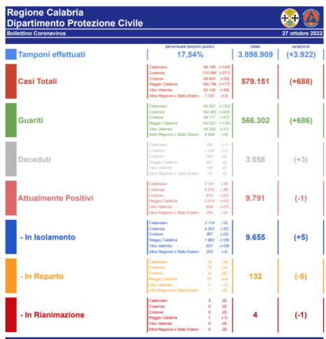 CATANZARO Le persone risultate positive al Coronavirus sono, dall’inizio della pandemia, 579.151 (+688 rispetto a ieri). In Calabria, ad oggi, il totale dei tamponi eseguiti è pari a 3.898.909 (+3.922 nelle ultime 24 ore). Questi sono i dati giornalieri relativi all’epidemia da Covid-19 comunicati dai Dipartimenti di Prevenzione delle Asp della Regione Calabria.