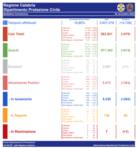 CATANZARO Secondo i dati giornalieri relativi all’epidemia da Covid-19 comunicati dai Dipartimenti di Prevenzione delle Asp della Regione Calabria, sono 879 i nuovi contagi registrati (su 4.726 tamponi effettuati), +614 guariti e 1 morto (per un totale di 3.067 decessi). Il bollettino, inoltre, registra +264 attualmente positivi, ricoveri stabili (per un totale di 130) e, infine, +1 terapie intensive (per un totale di 7).