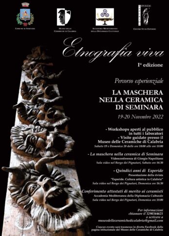 «In un mondo sempre più appiattito dalle spinte globaliste – aggiungono gli organizzatori – Seminara conserva, dunque, una delle ultime espressioni di Arte popolare che individua nel ristretto nugolo di ceramisti superstiti i custodi di un patrimonio collettivo – come è stato già notato – ancora vitale ma altrove smarrito da secoli. Una comprensione più articolata del fenomeno sarà resa possibile dal percorso storico presente nelle sale del Museo delle Ceramiche di Calabria che rimarrà aperto al pubblico con orario continuato, offrendo servizi di visite guidate e focus di approfondimento anche sulle potenzialità per la Calabria di tradurre certe forme di “arretratezza” in risorse economiche». Tra gli eventi in programma, organizzati anche grazie al supporto del Comune di Seminara, una conferenza sulla “Maschera nella ceramica di Seminara”, in cui Giorgio Napolitano indagherà i significati poliedrici celati dietro questo oggetto enigmatico e l’onnipresente legame con la cultura magnogreca e bizantina che si insinua nella fattispecie di un elemento tipologico sviluppato anche in numerosi esempi di portali lapidei, spesso i complementi più rappresentativi dell’austera architettura calabrese del Sei e Settecento. Nel pomeriggio di domenica l’incontro con Mario Panarello, Direttore del museo, che presenterà i traguardi raggiunti dal Centro di Studi Esperide in 15 anni di attività editoriale attraverso la rivista “Esperide. Cultura artistica in Calabria”.