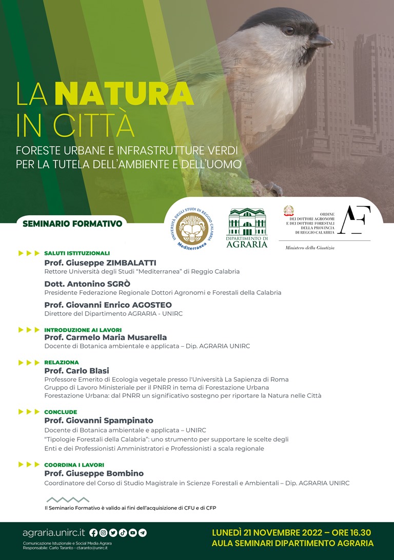 REGGIO CALABRIA Lunedì 21 novembre ore 16.30 nell’Aula Seminari Dipartimento di Agraria dell’Università Mediterranea di Reggio Calabria (Località Feo di Vito) si terrà il seminario “La Natura in Città: foreste urbane e infrastrutture verdi per la tutela dell’ambiente e dell’uomo” finalizzato ad integrare il percorso didattico e formativo sia degli Studenti dei Corsi di Studio Triennale e Magistrale in Scienze Forestali e Ambientali, sia dei Laureati che frequentano i Corsi di Dottorato e di Master attivi presso il Dipartimento di Agraria. D’altra parte, la rilevanza e l’attualità del tema trattato si inserisce nell’ambito delle iniziative di formazione e di aggiornamento rivolte ai professionisti del settore, su cui è attiva una collaborazione tra il Dipartimento di Agraria dell’Università “Mediterranea” e la Federazione Regionale dei Dottori Agronomi e Forestali della Calabria.