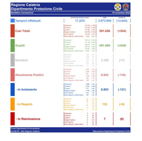 Questi sono i dati giornalieri relativi all’epidemia da Covid-19 comunicati dai Dipartimenti di Prevenzione delle Aziende sanitarie provinciali della Regione Calabria.